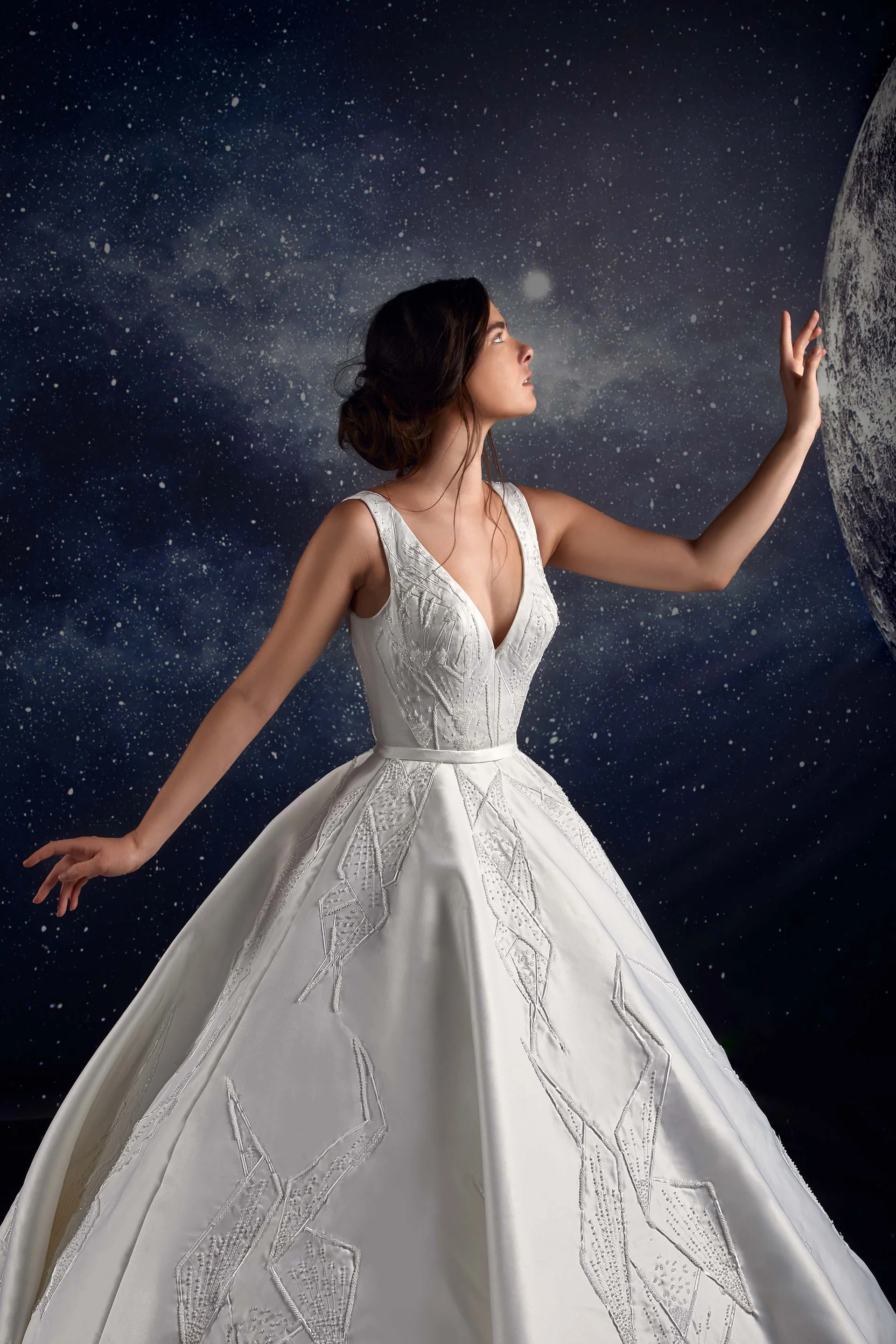 The dress has a modern yet classic feel, with its combination of traditional ball gown silhouette and contemporary embroidery patterns. The background of stars and space gives it a whimsical, almost ethereal quality.