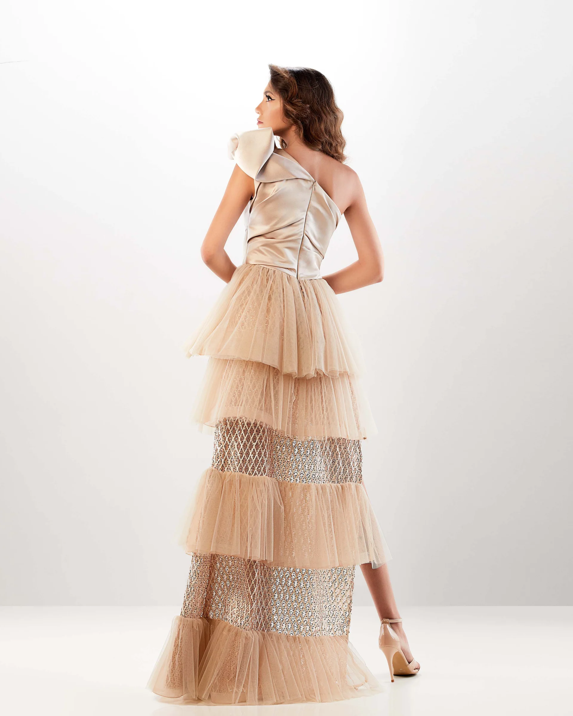 The combination of the satin draped top, embroidered tulle skirt, and ruffled tulle with a slit makes this gown a standout piece. It embodies a perfect blend of contemporary design and classic sophistication, ideal for making a statement at any formal event. The nude beige color enhances the gown's ...
