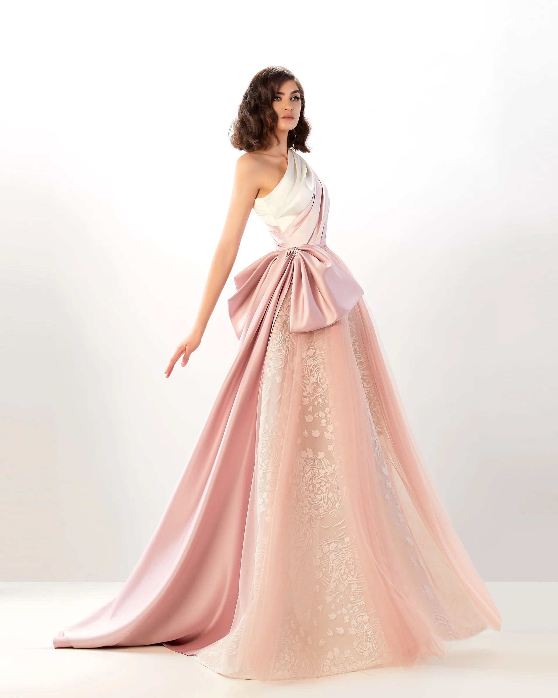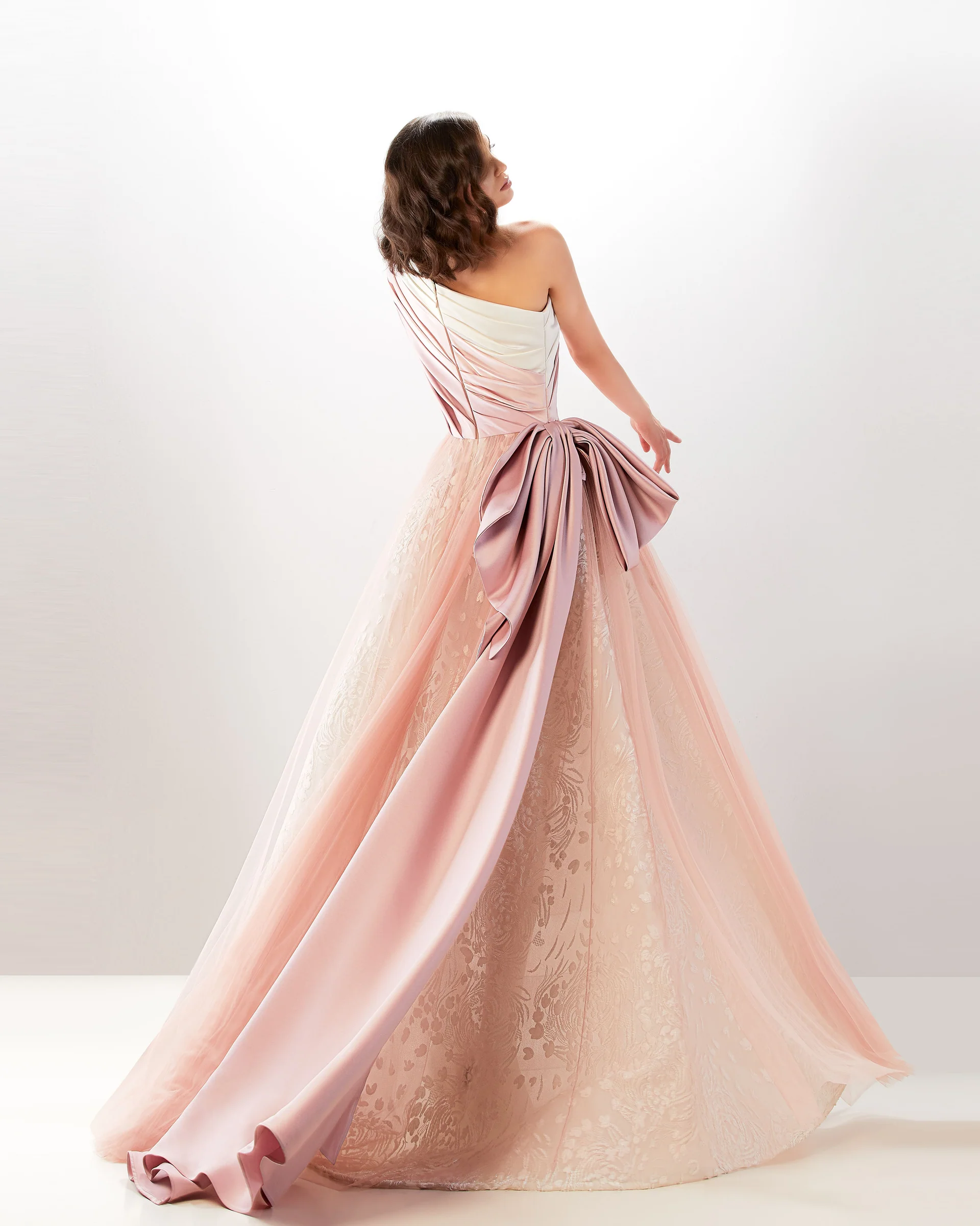 The satin ball gown features elegant draping and a gracefully tied bow, complemented by an intricately embroidered tulle skirt. This design blends luxurious fabric with intricate detailing, creating a sophisticated silhouette that embodies timeless beauty and refined craftsmanship. ...