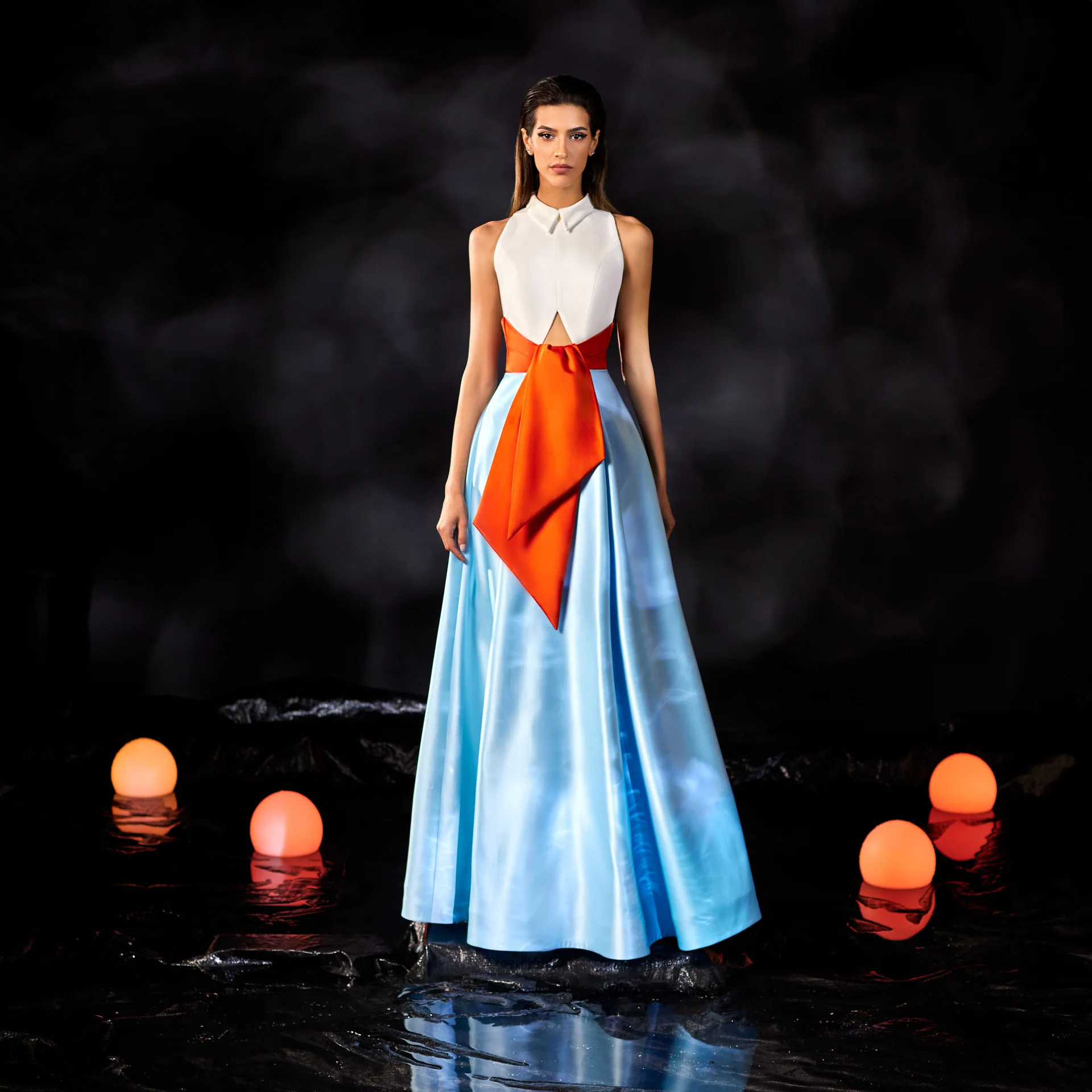 Make an unforgettable entrance in this exquisite evening gown. Crafted from a luxurious blend of crepe and satin, this tri-color gown features a flattering collared neckline and sleek sleeveless design for a modern yet sophisticated look. The fitted bodice with a unique cut-out detail adds a touch o ...