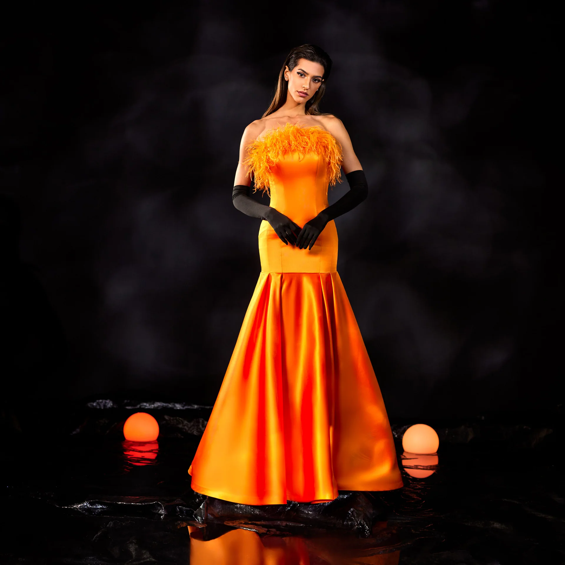 Satin Gown with Feathers