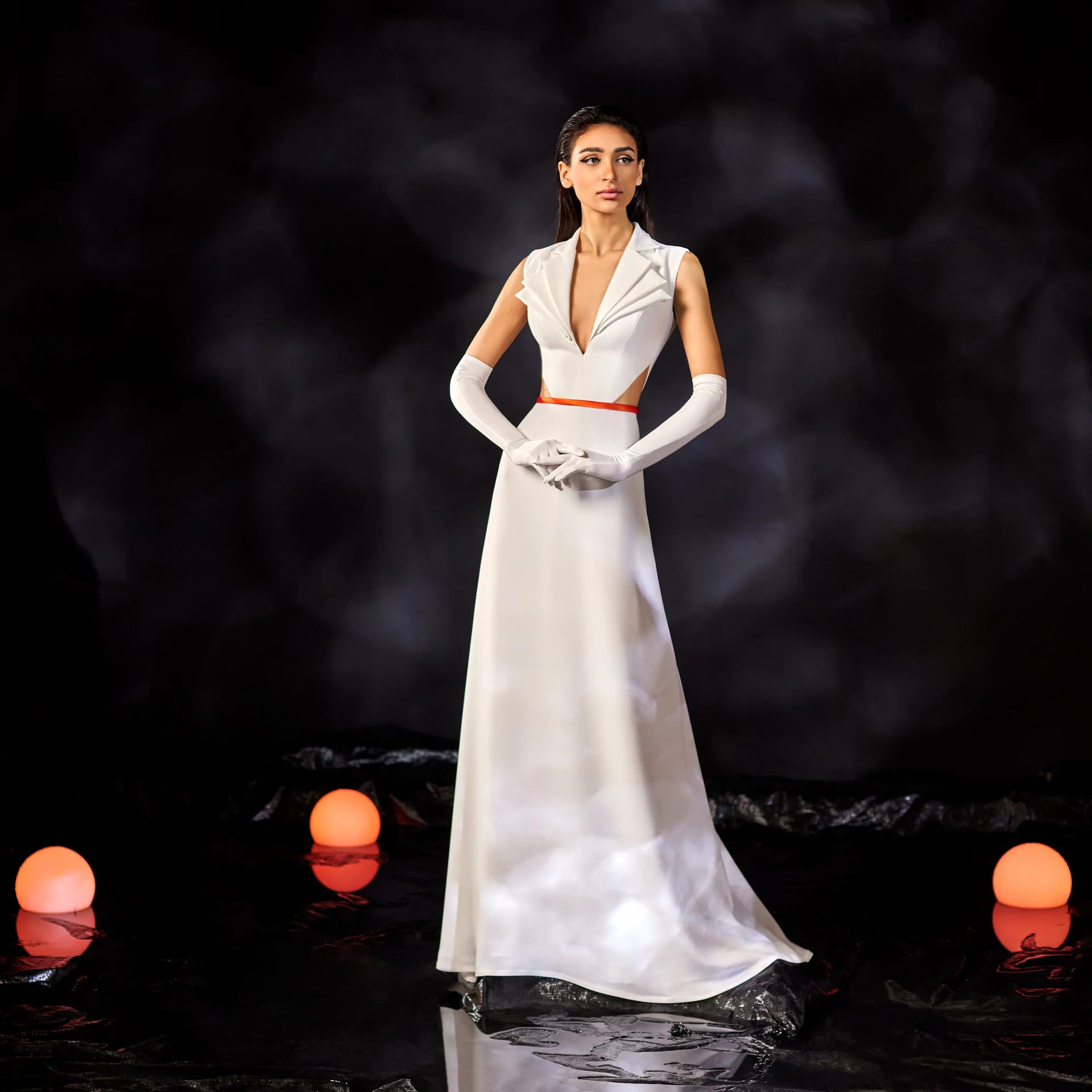 Elevate your evening look with this sophisticated crepe gown. Featuring a deep V-neckline and sleeveless design, this gown offers a bold yet refined silhouette. The fitted bodice and exposed sides add a contemporary allure, while the long A-line skirt gracefully flows into ...