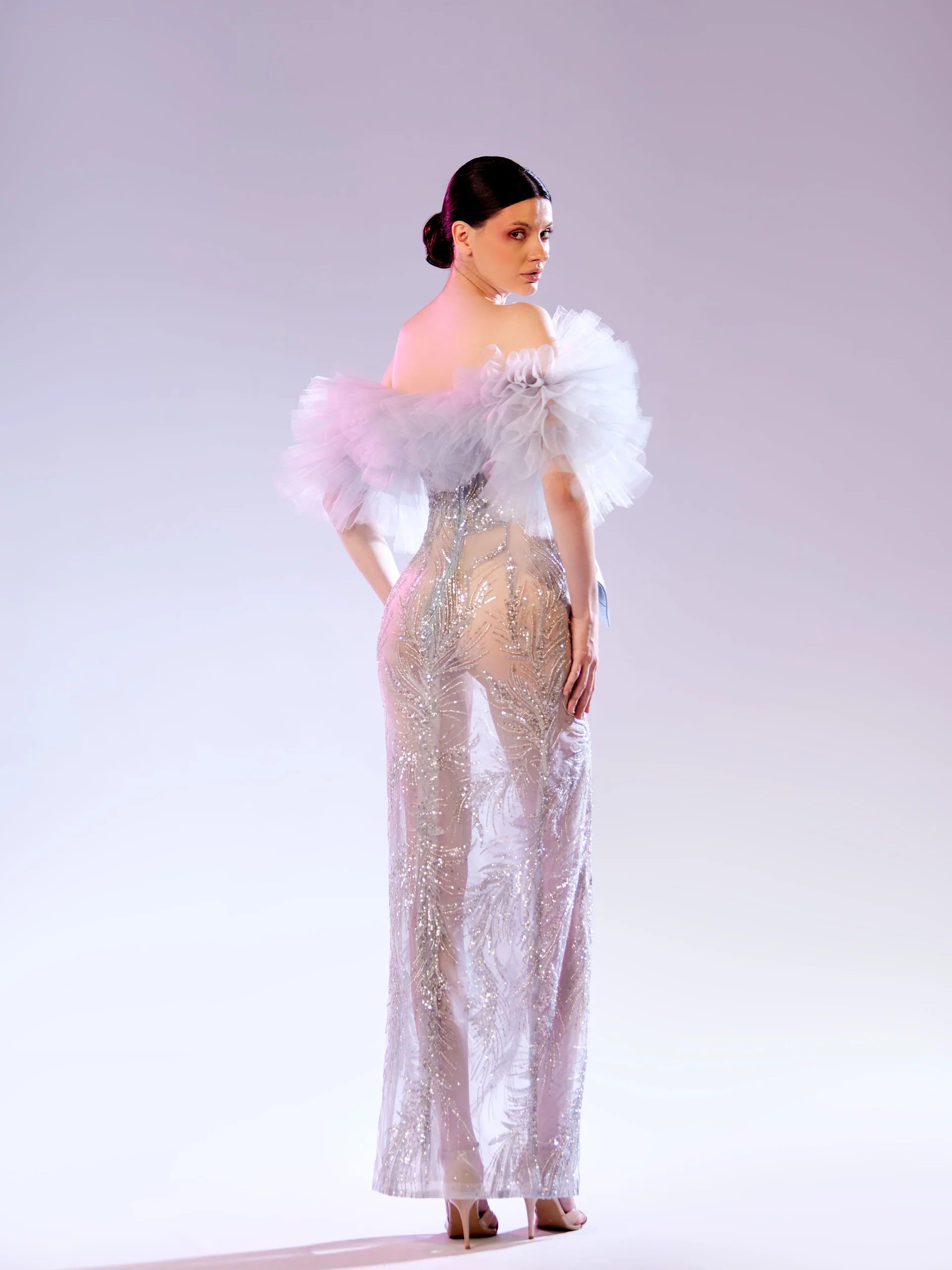 Embroided tulle evening gown with ruffles.