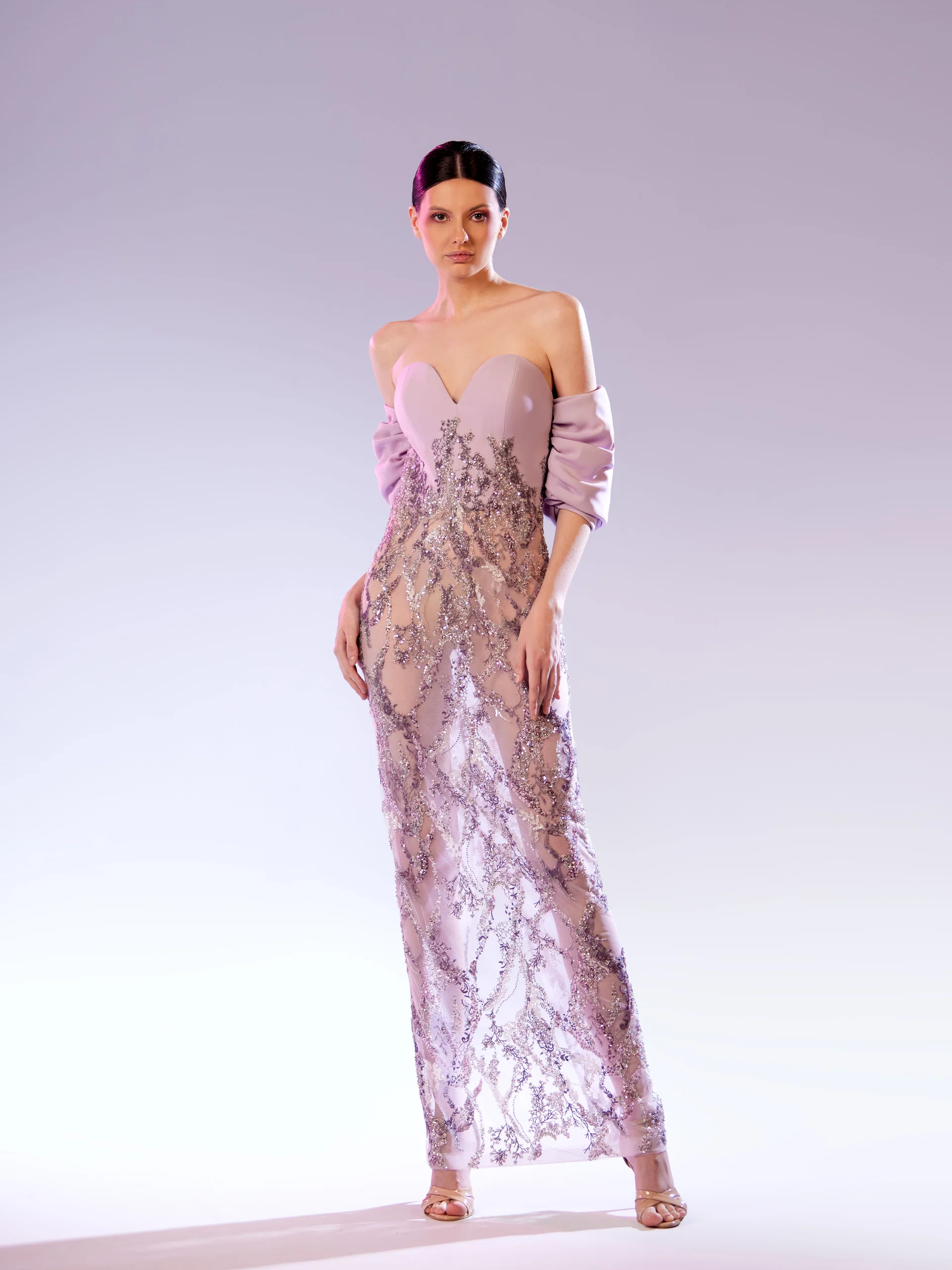 Embroided tulle evening gown with a crepe corset and bow sleeves.