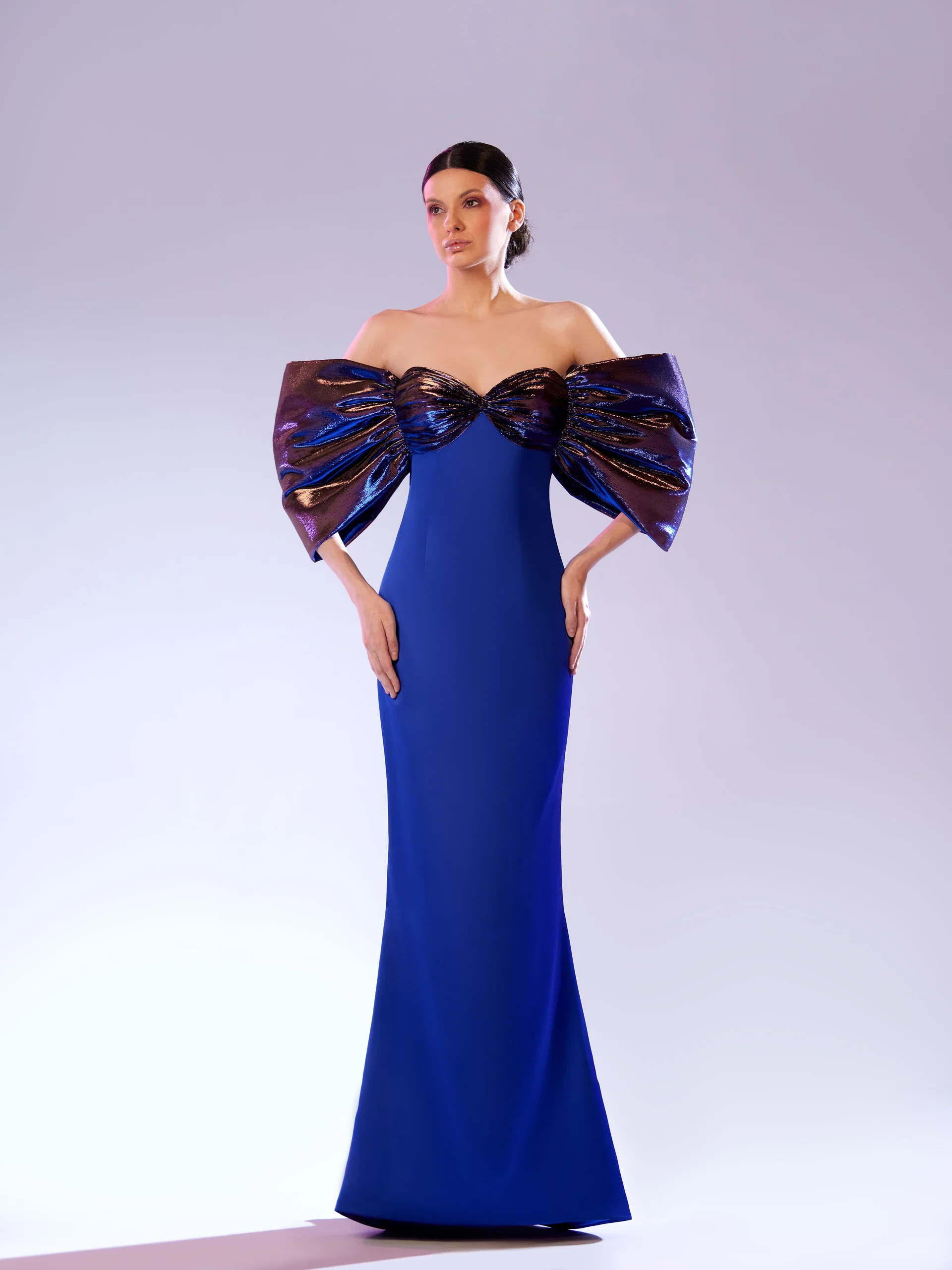 Satin evening gown with oversized metallic fabric sleeves.