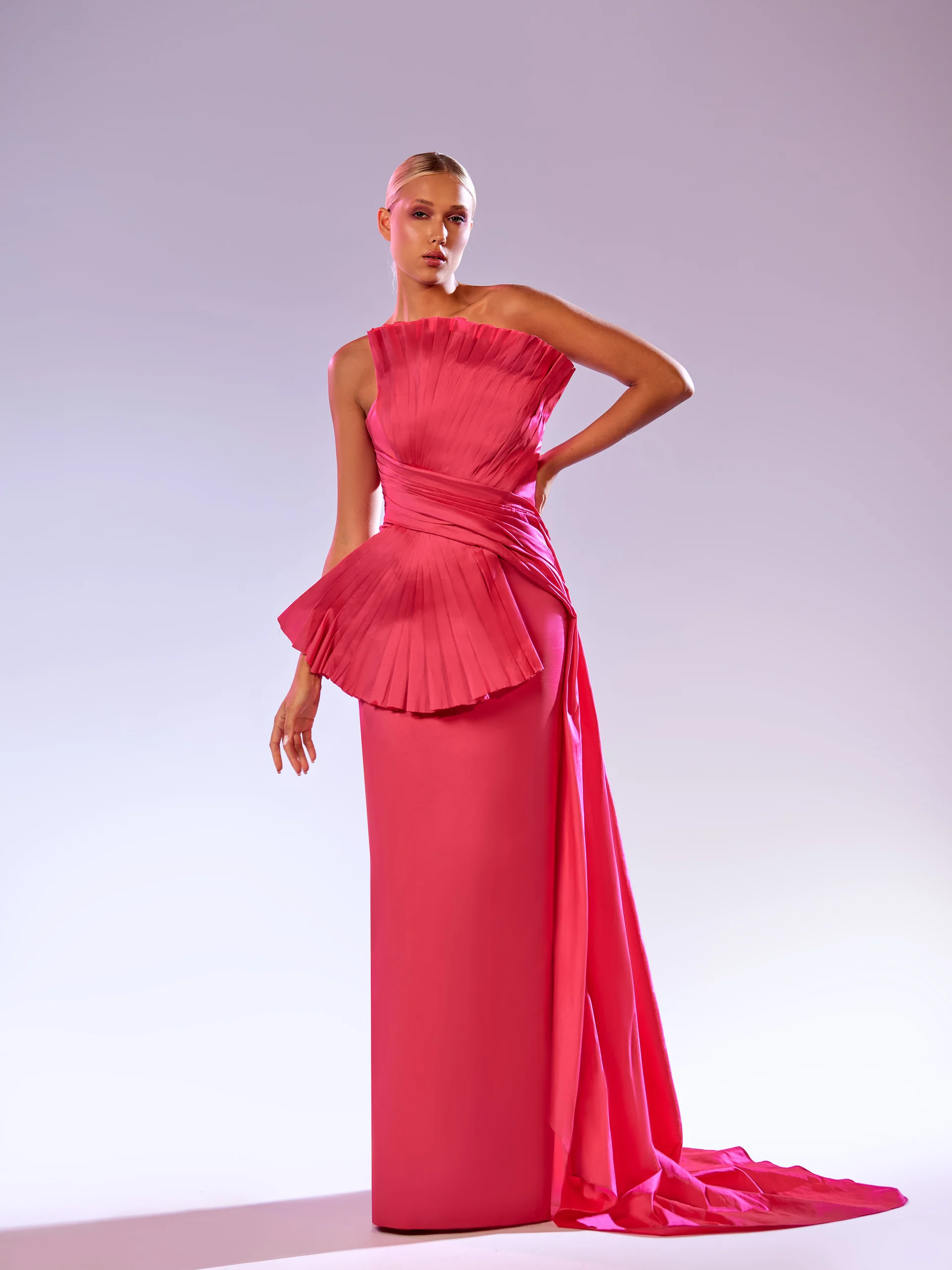 Hot pink taffeta evening dress with fan like drapping.