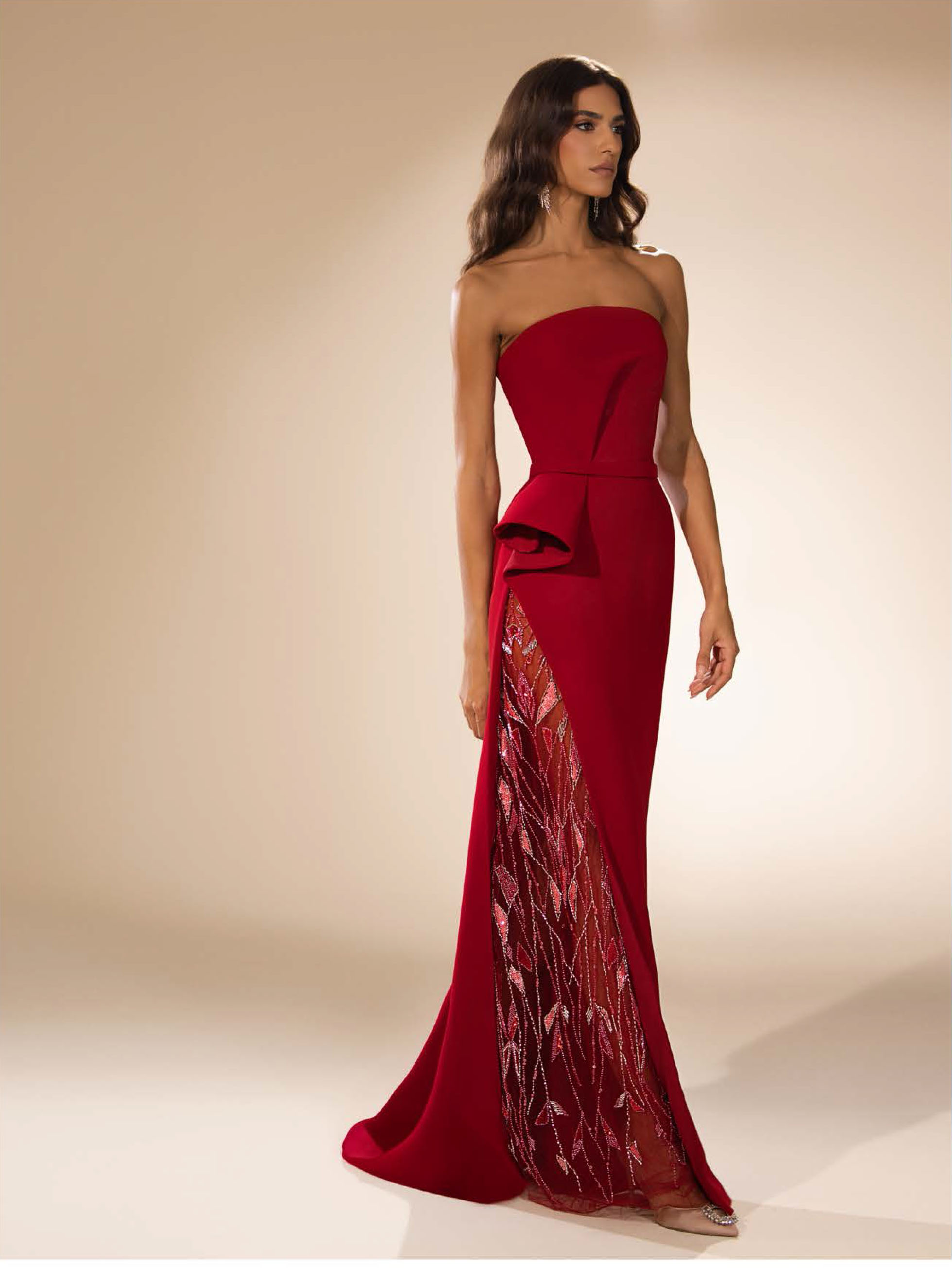 Off-shoulder crêpe evening gown with sculptural spiral draping and embroidered tulle inserts, blending architectural elegance with delicate craftsmanship.