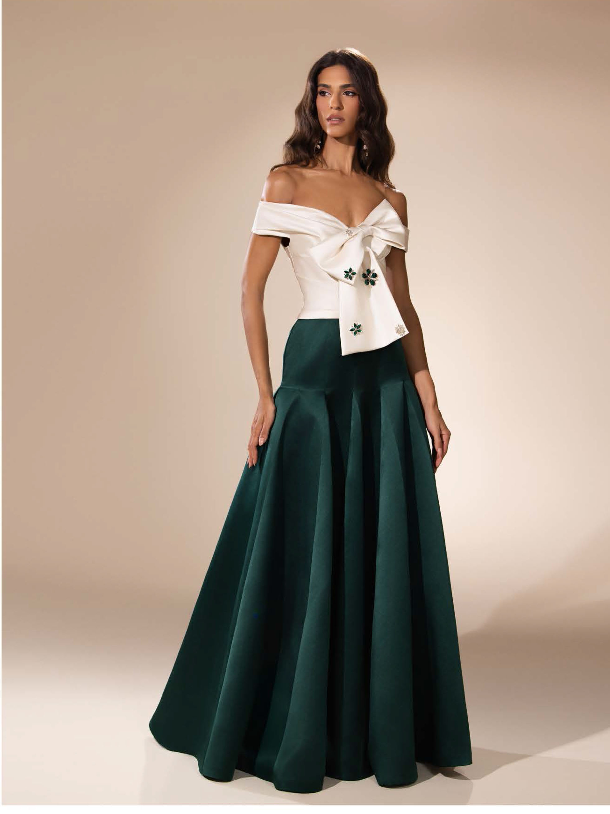 Satin Rasemir evening gown featuring a sculptural bow detail and hand-embroidered crystal accents, radiating timeless elegance and couture finesse.