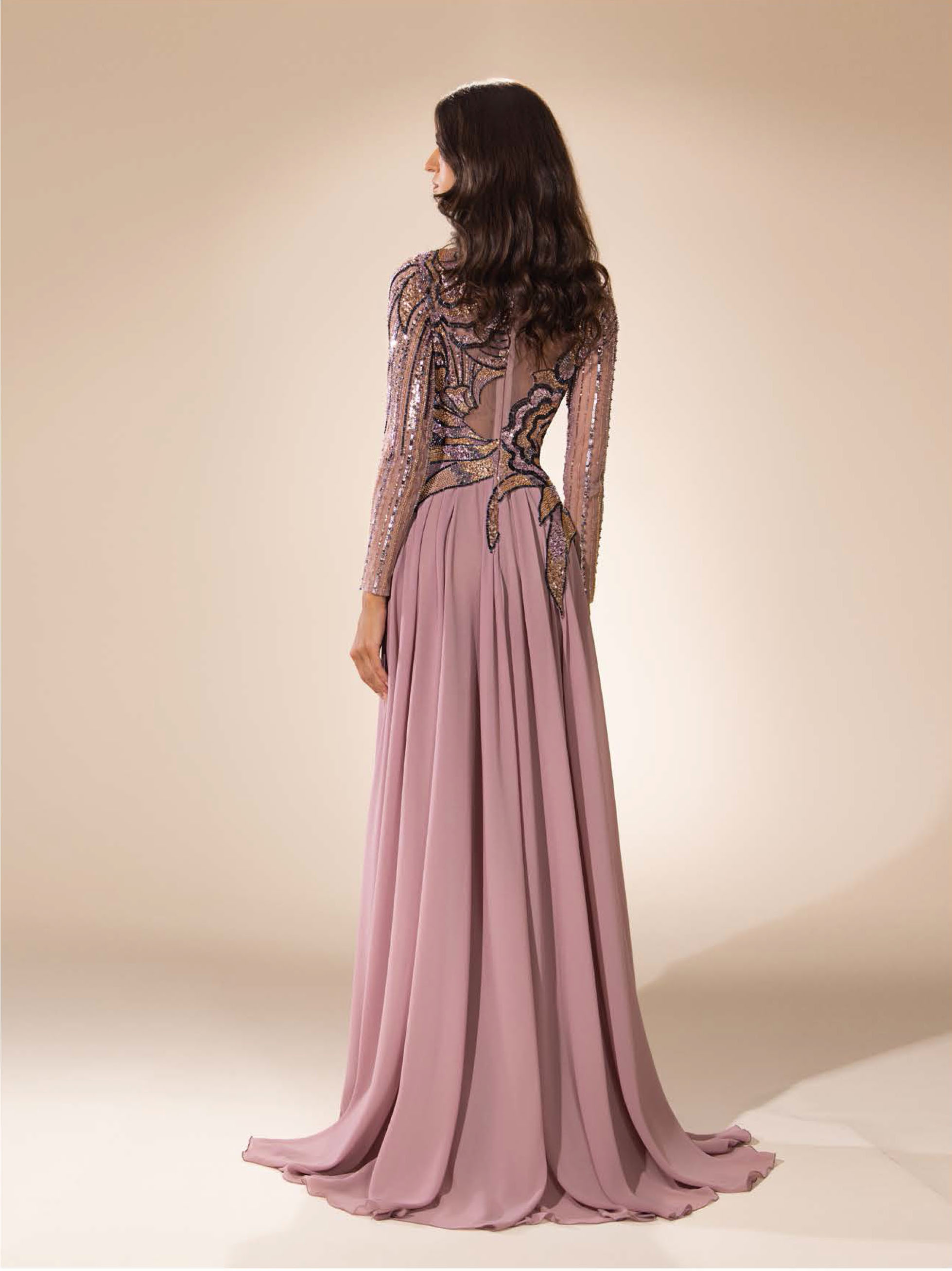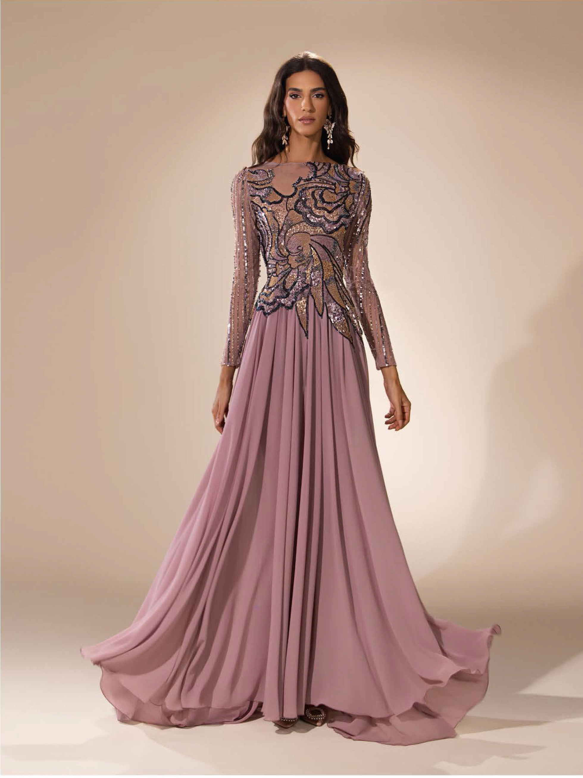 Crêpe evening gown with floral-shaped embroideries, featuring sheer long sleeves and a high neckline.