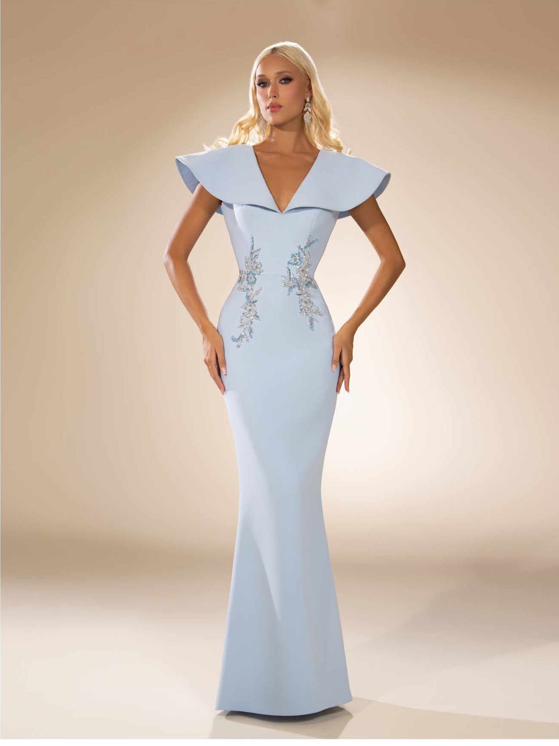 Crêpe evening dress with a sculptural collar and delicate floral embroidery, blending architectural elegance with romantic detailing.